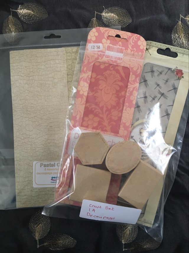 This set contains 1 x Deco Mache, and 1 x Santoro Decoupage papers (total £5.00), 1 x Pastel Creams Vintage Papers at £4.00, and 4 plain ring-sized boxes at £2.00.