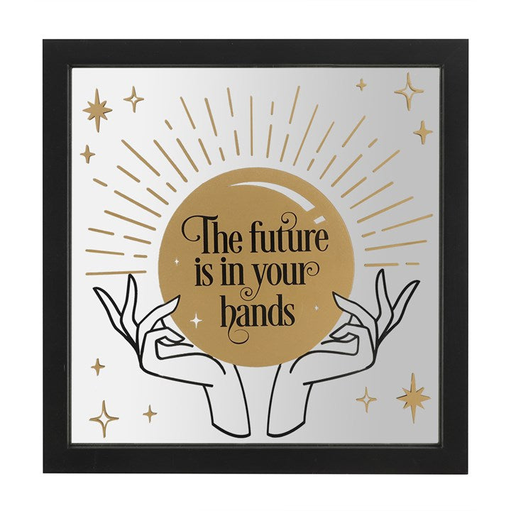 This mirrored wall hanging is sure to add mystery and whimsy to any trendy home. A gold foil crystal ball with 'The future is in your hands' text is accented by elegant hands and starry details on this mystical piece of wall art.