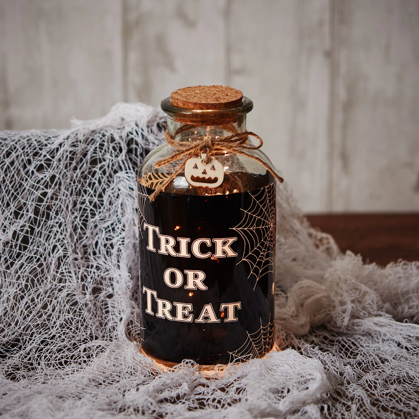 The decorative Halloween light up bottle has a cork lid and is embellished with jute string and a little wooden pumpkin.